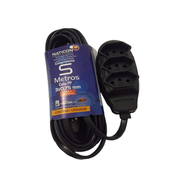 EXTENSÃO NATICON TRIPLA ”2P+T” PP 2X0,75 PRETA 5 METROS